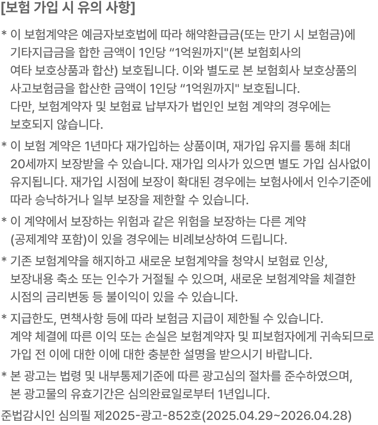 이 보험계약은 예금자보호법에 따라 해약환급금(또는 만기 시 보험금)에 기타지급금을 합한 금액이 1인당 “1억원까지”(본 보험회사의 여타 보호상품과 합산) 보호됩니다. 이와 별도로 본 보험회사 보호상품의 사고보험금을 합산한 금액이 1인당 “1억원까지” 보호됩니다.